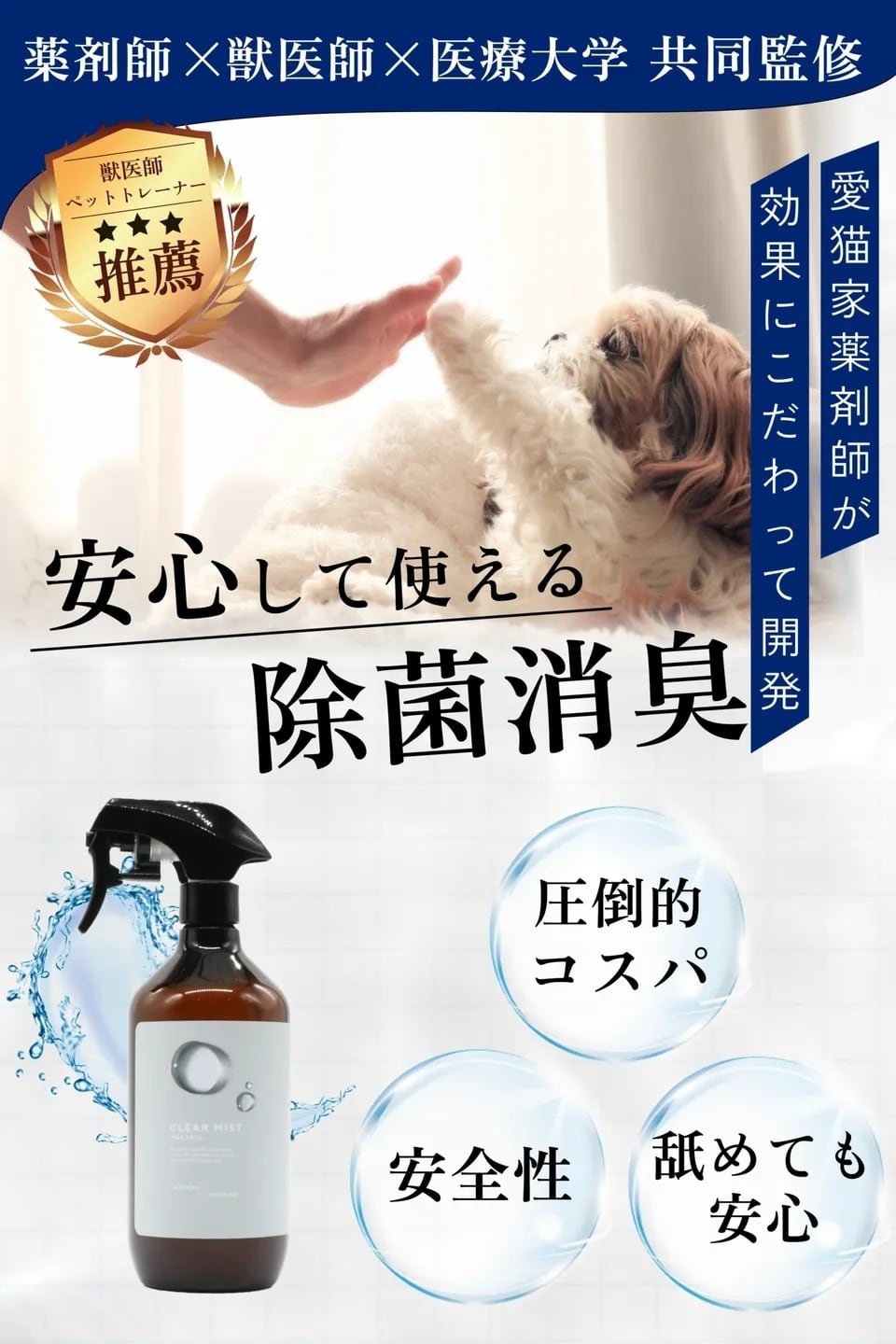 【用途】 一般家庭や動物病院内、 ペットホテル等における除菌・消臭 診察台(犬、猫、小動物等の) ゲージ、手術室、待合室等の清掃および除菌・消臭