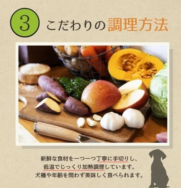 ・副産物や粗悪原料は不使用、人と同じ食材はもちろん、その中でも選りすぐり素材本来の美 味しさを大切に調理からパッケージングまで徹底した衛生管理を実施。
